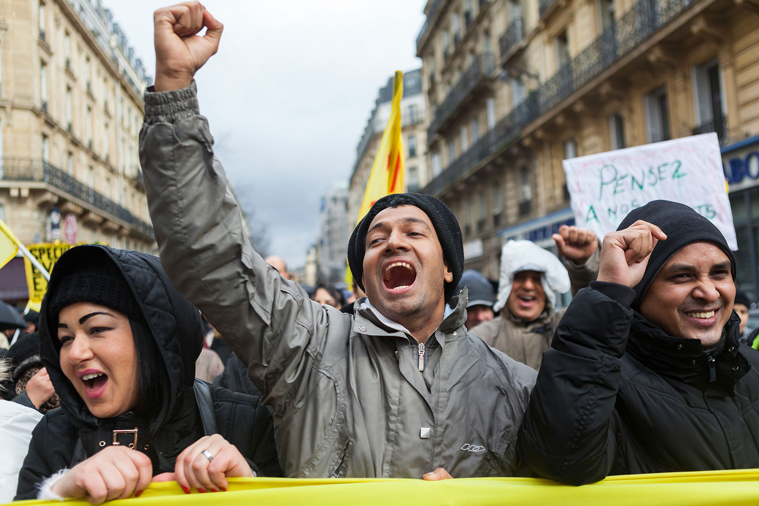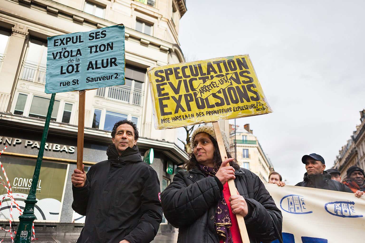 Manifestation nationale pour les 10 ans de la Loi DALO (Droit Au Logement Opposable) co-organisée par le DAL, le Secours Catholique – Caritas France, la Fondation Abbé Pierre, le RESEL (Réseau Stop aux Expulsions de Logement), l’ACDL et le CAL Paris 18e. Cortège de la place de la République au Conseil Constitutionnel. Avec Christophe Robert, Jean-Baptiste Eyraud, Benoît Filippi. France, Paris, 5 mars 2017