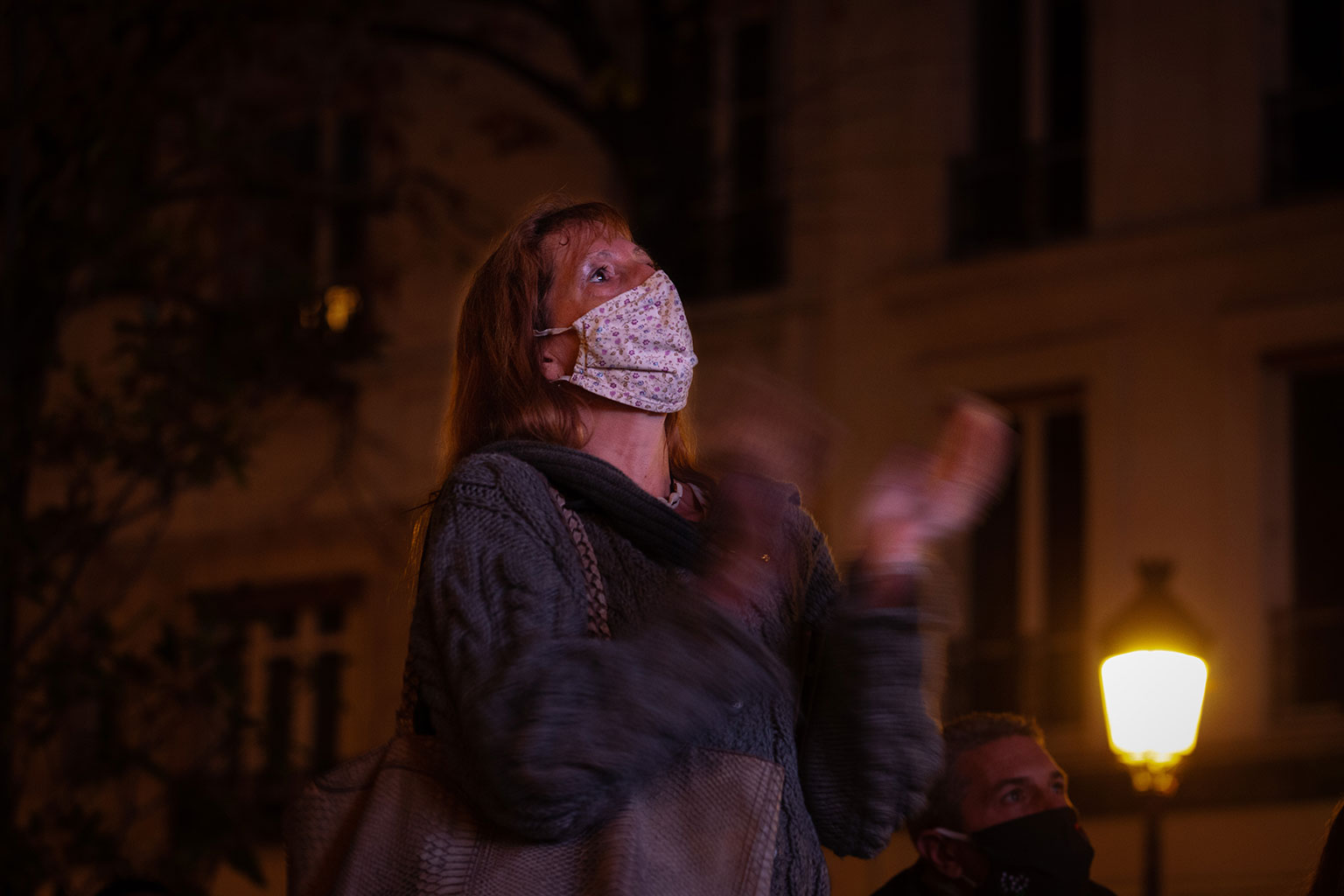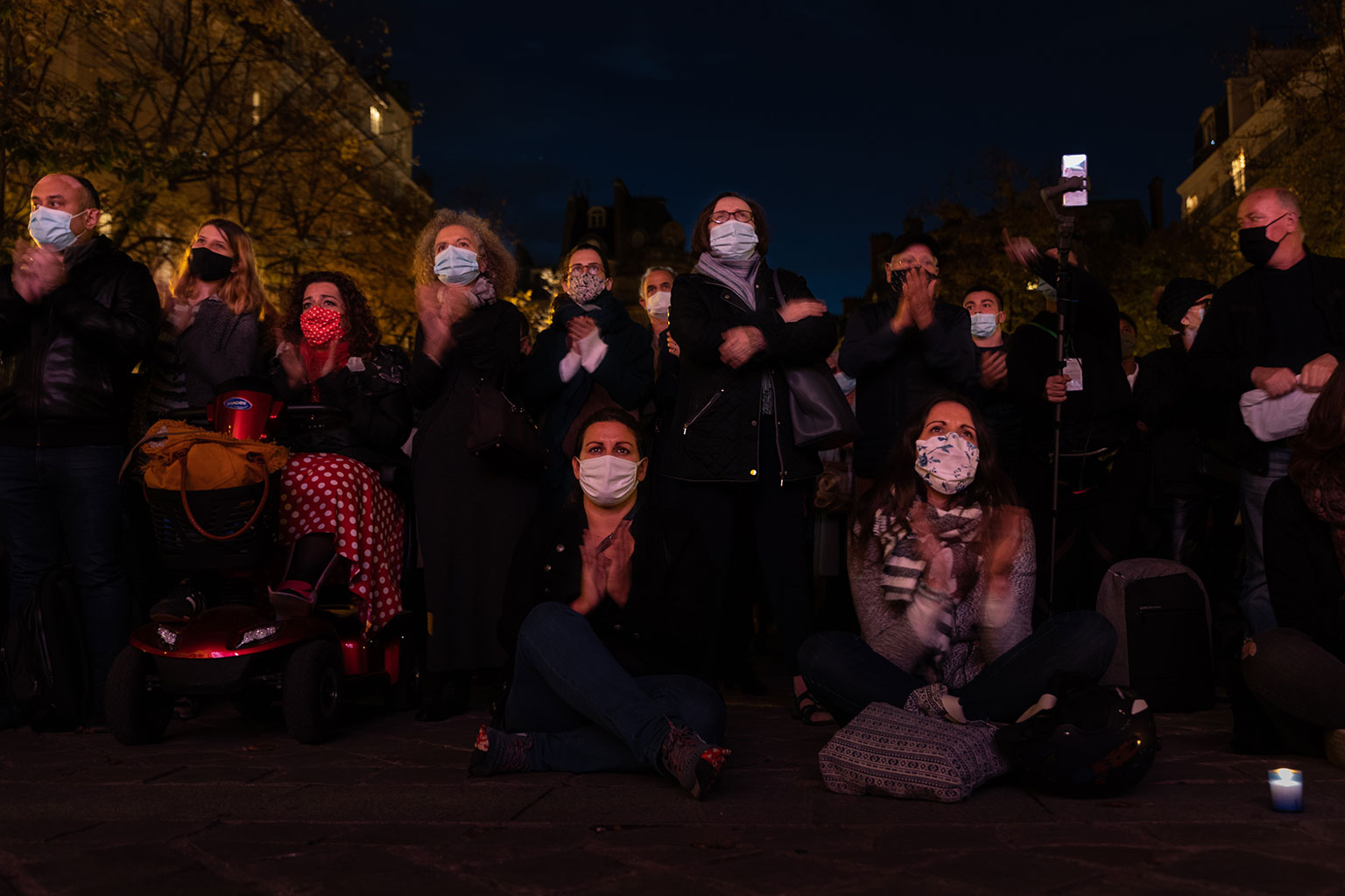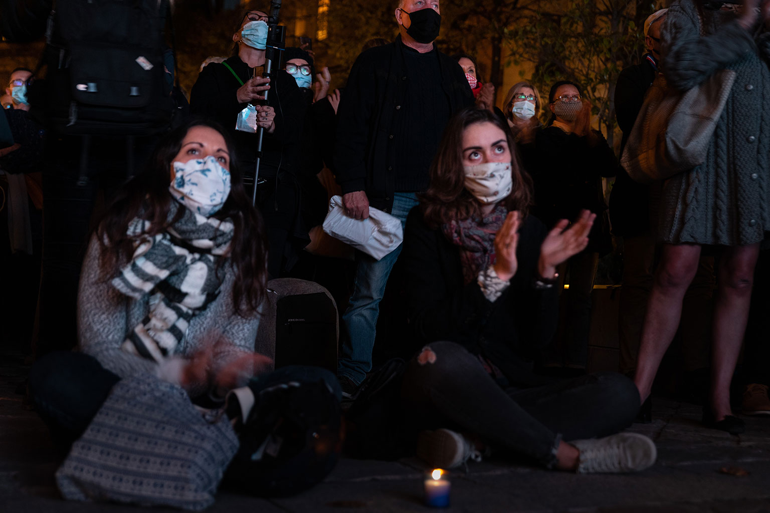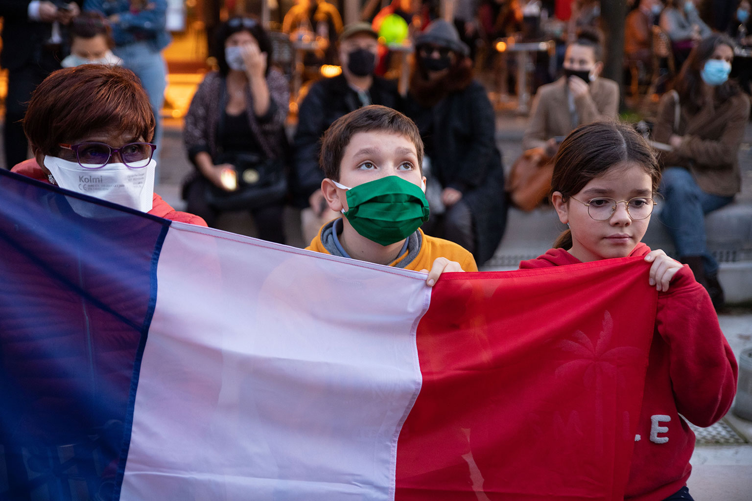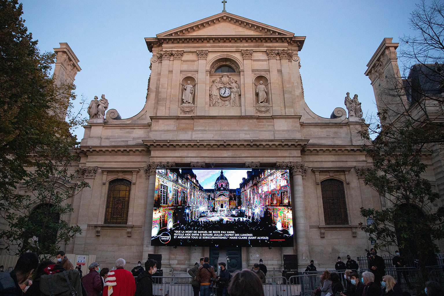 Rassemblement de plusieurs centaines de personnes, place de la Sorbonne, pour l’hommage national au professeur Samuel Paty, enseignant au collège du Bois d’Aulne, à Conflans-Sainte-Honorine (Yvelines), décapité le vendredi 16 octobre 2020 pour avoir montré en classe des caricatures du journal Charlie Hebdo, par un jeune islamiste Tchétchène de 18 ans. Plusieurs personnes, dont deux mineurs de 14 et 15 ans, auraient participé en publiant son adresse et en le désignant physiquement à son assassin.