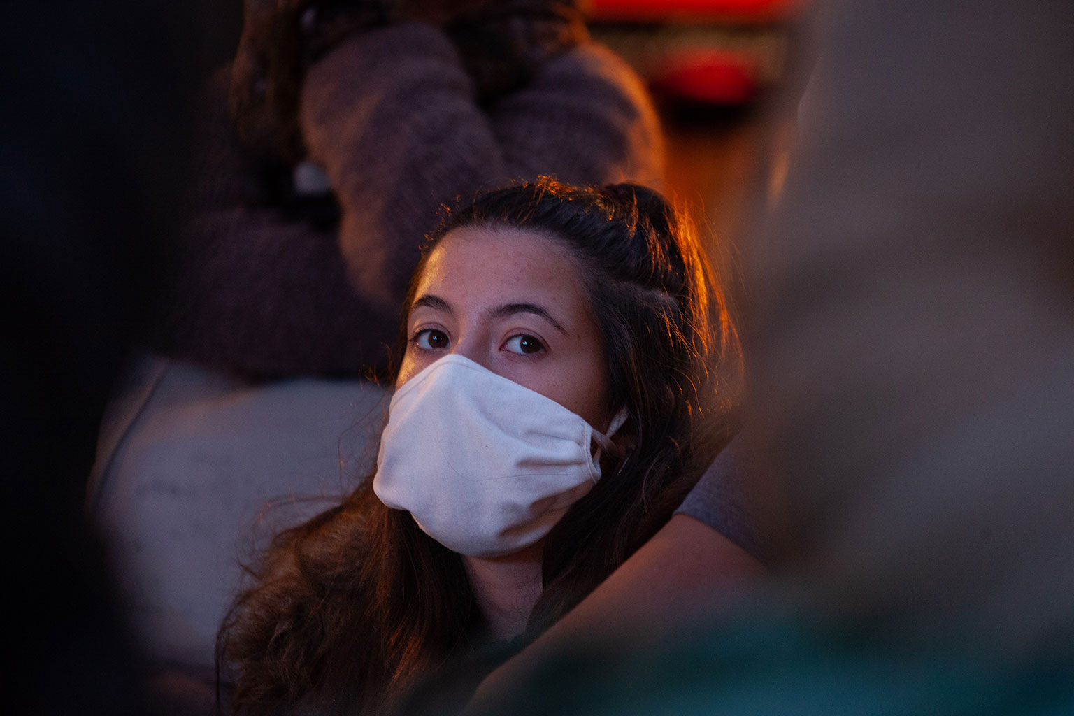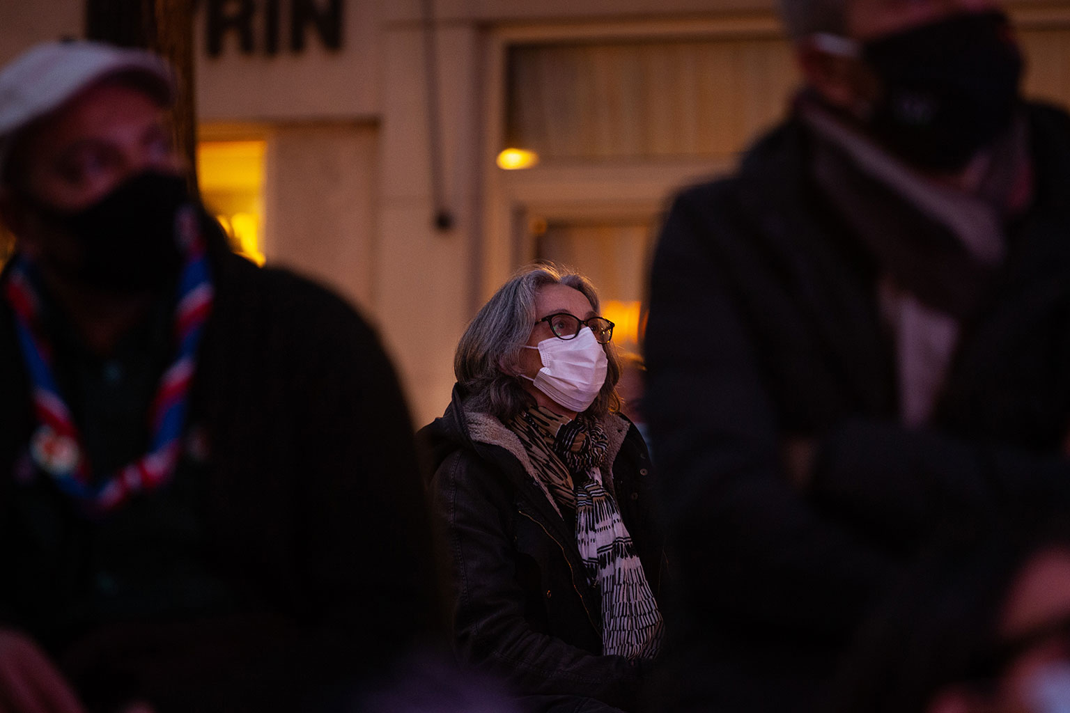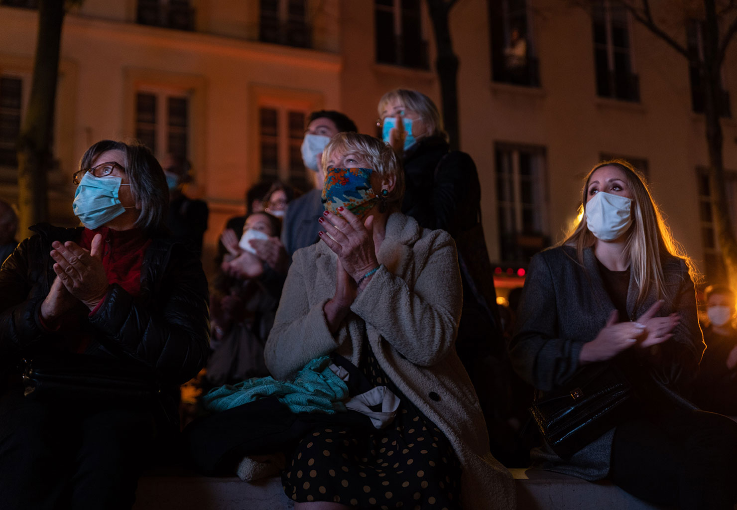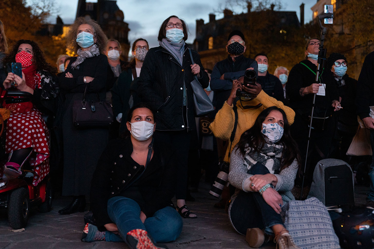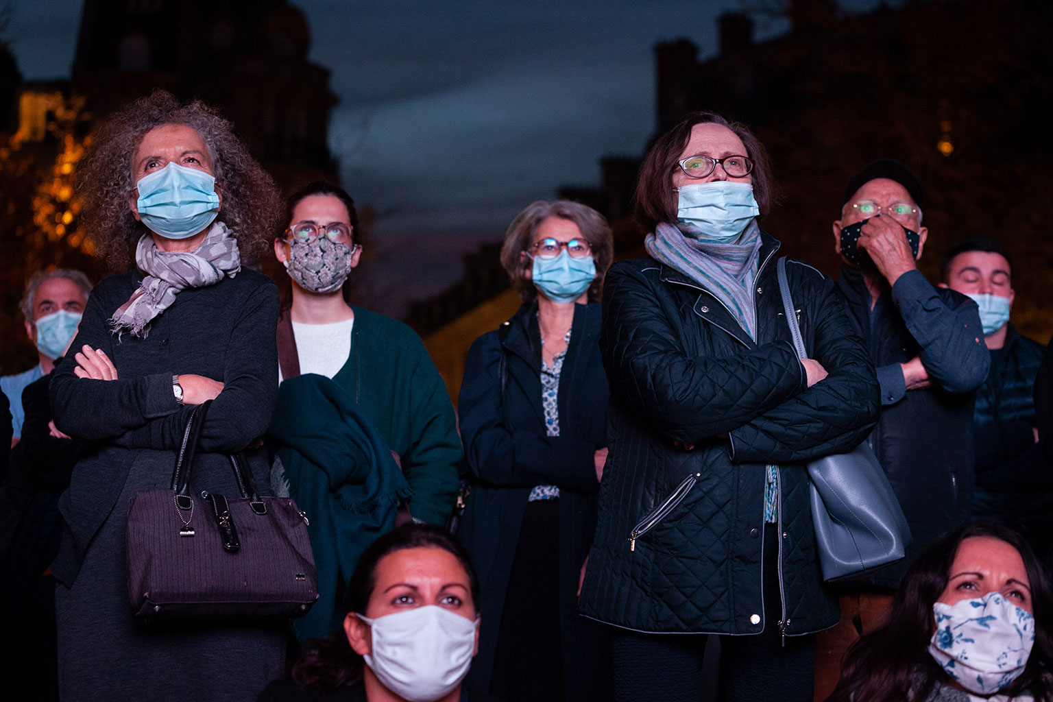 Rassemblement de plusieurs centaines de personnes, place de la Sorbonne, pour l’hommage national au professeur Samuel Paty, enseignant au collège du Bois d’Aulne, à Conflans-Sainte-Honorine (Yvelines), décapité le vendredi 16 octobre 2020 pour avoir montré en classe des caricatures du journal Charlie Hebdo, par un jeune islamiste Tchétchène de 18 ans. Plusieurs personnes, dont deux mineurs de 14 et 15 ans, auraient participé en publiant son adresse et en le désignant physiquement à son assassin.
