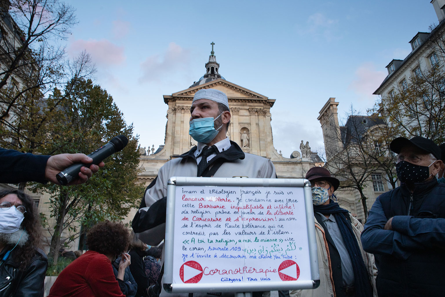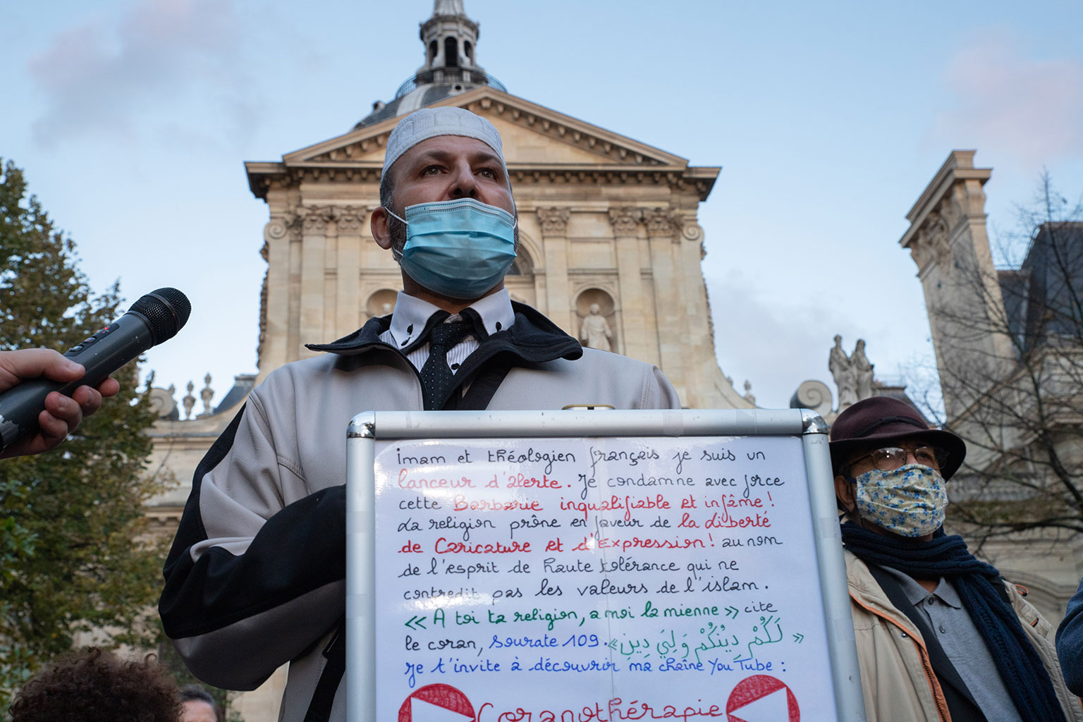 Hommage national au professeur décapité Samuel Paty, La Sorbonne, 16 octobre 2020. Un imam youtubeur fait sa publicité. Personne ne le dérangera.