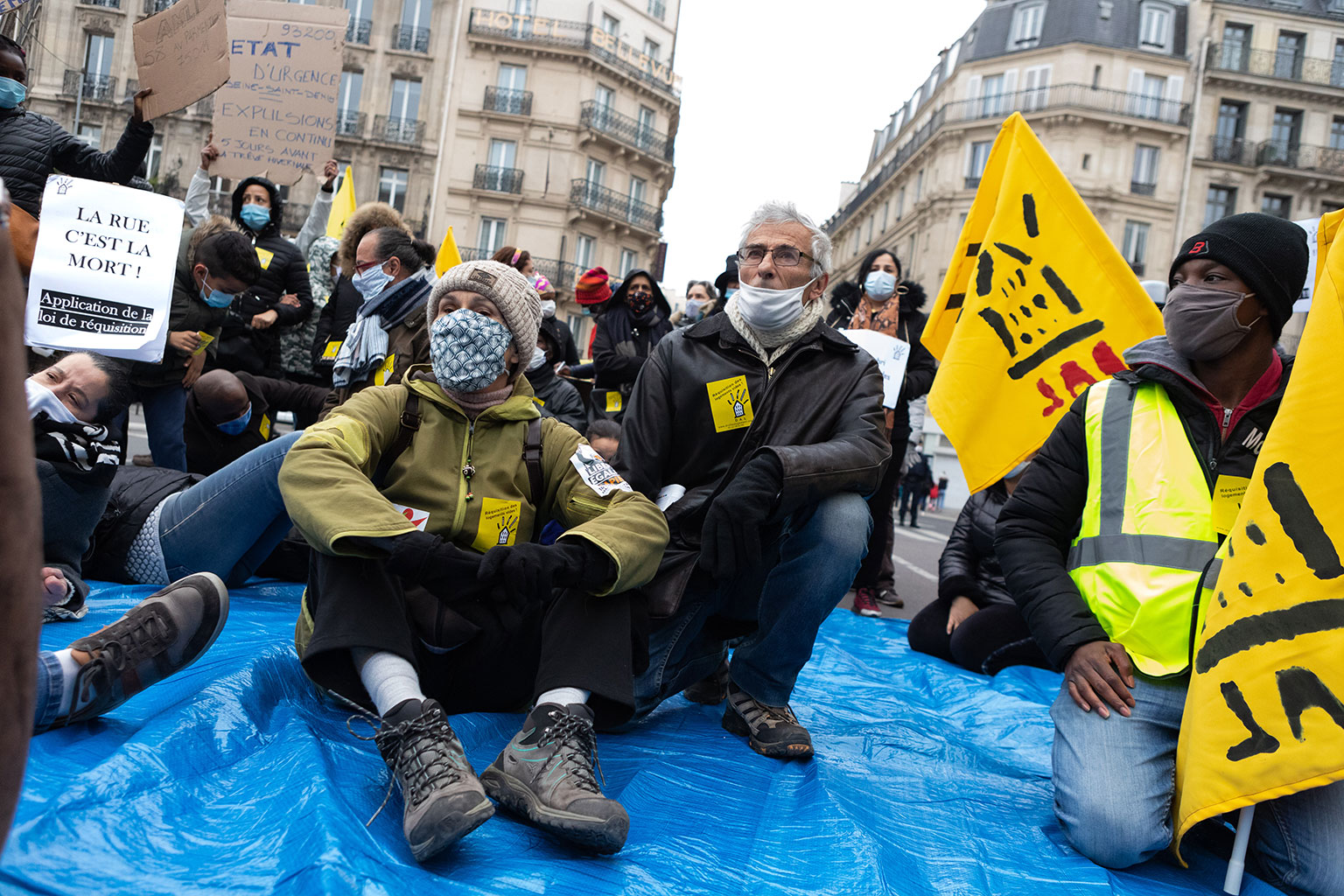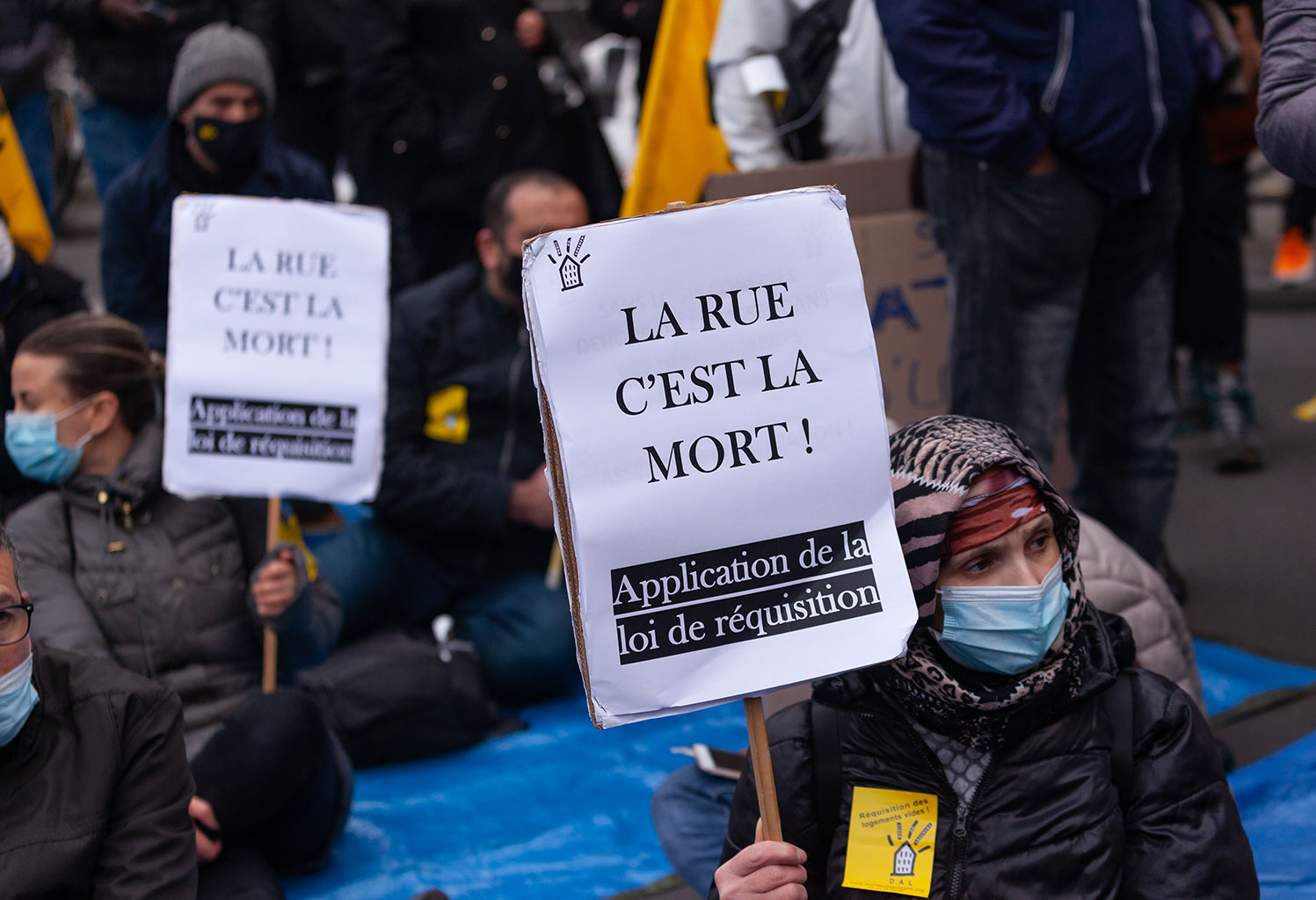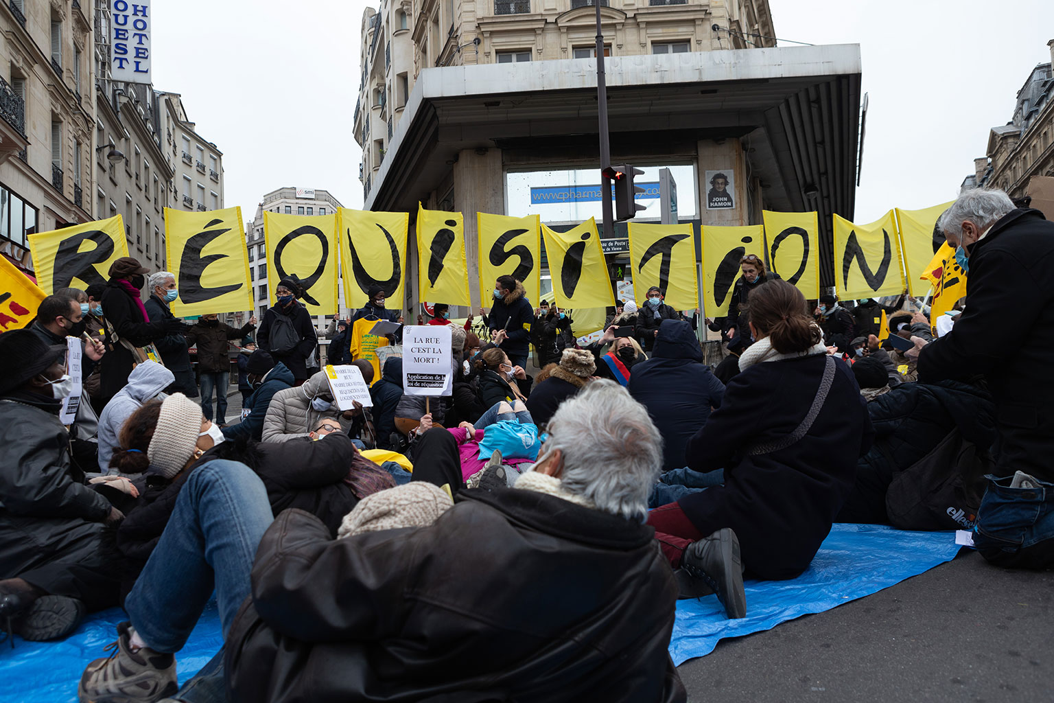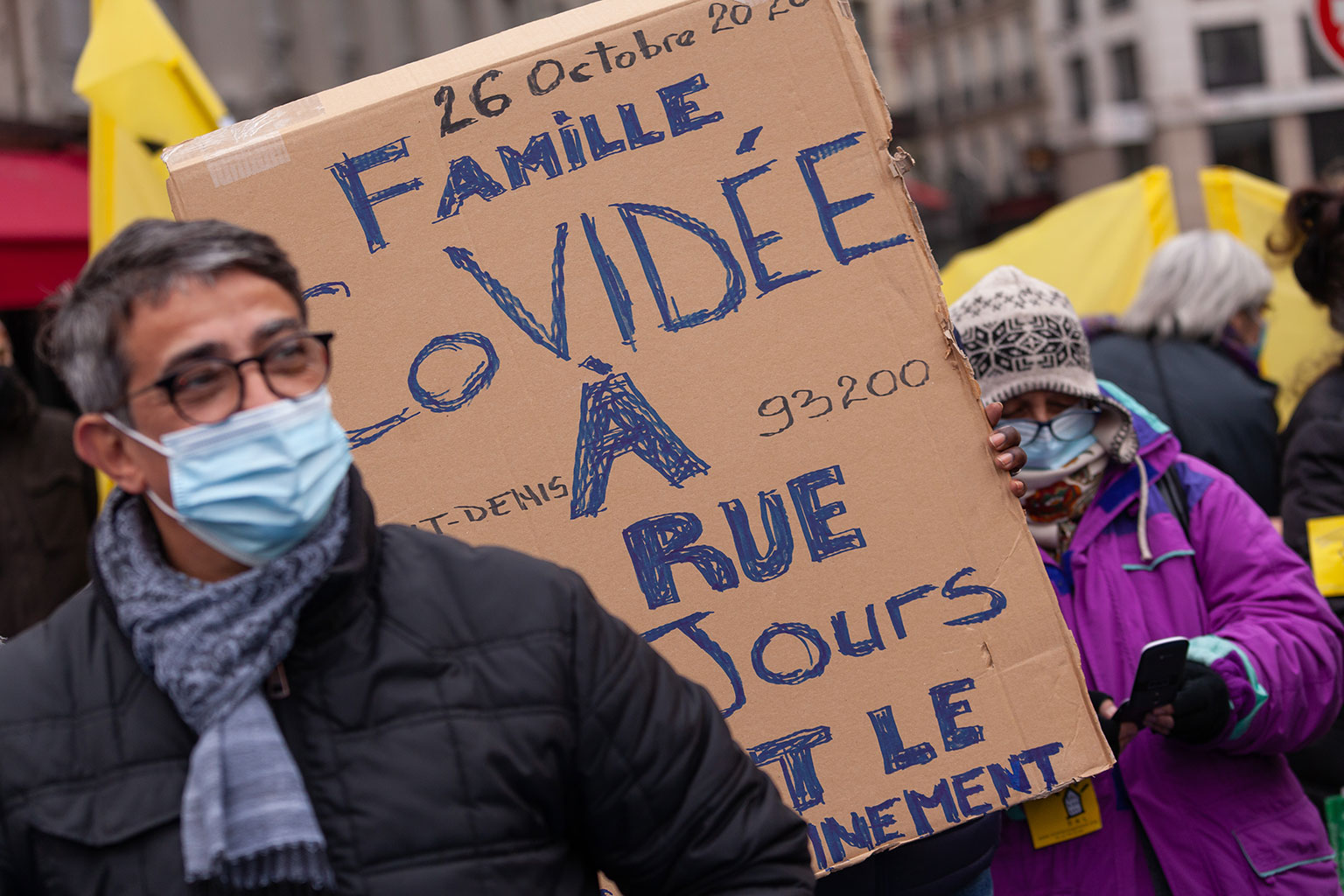 Ce rassemblement se tenait une nouvelle fois pour réclamer la réquisition d’un immeuble entier, vide, ainsi que tous les logements vides à Paris, en Île-de-France, et en France, qui seraient en nombre suffisants pour loger toutes les personnes sans domiciles fixes ou sans-abris.