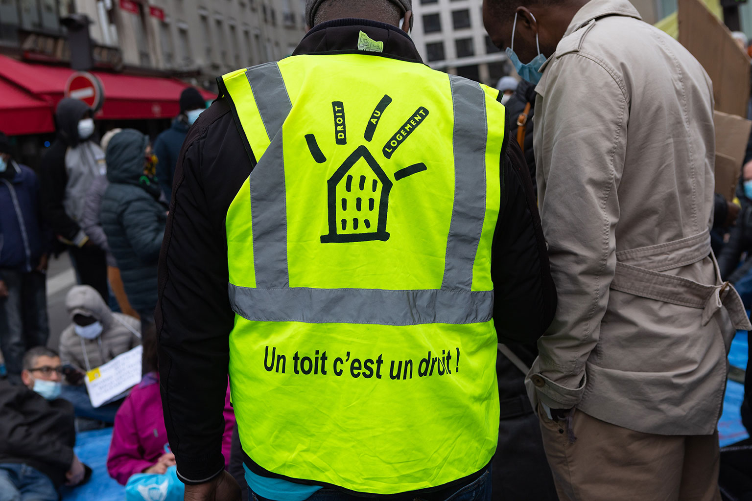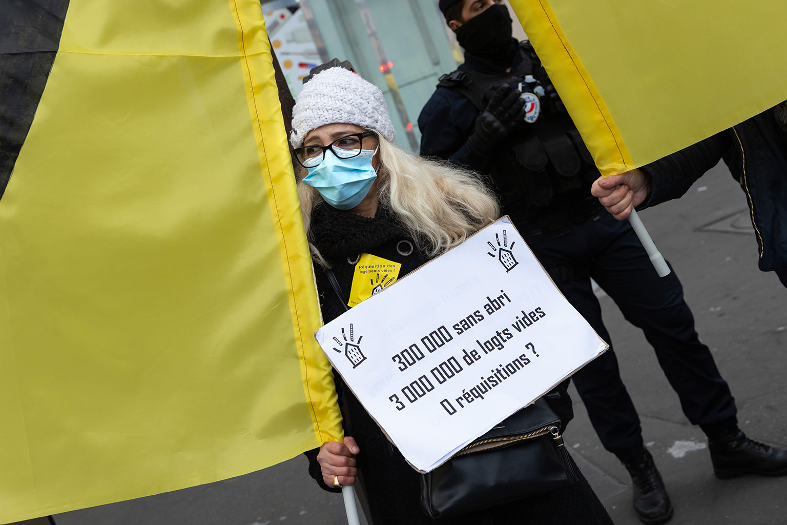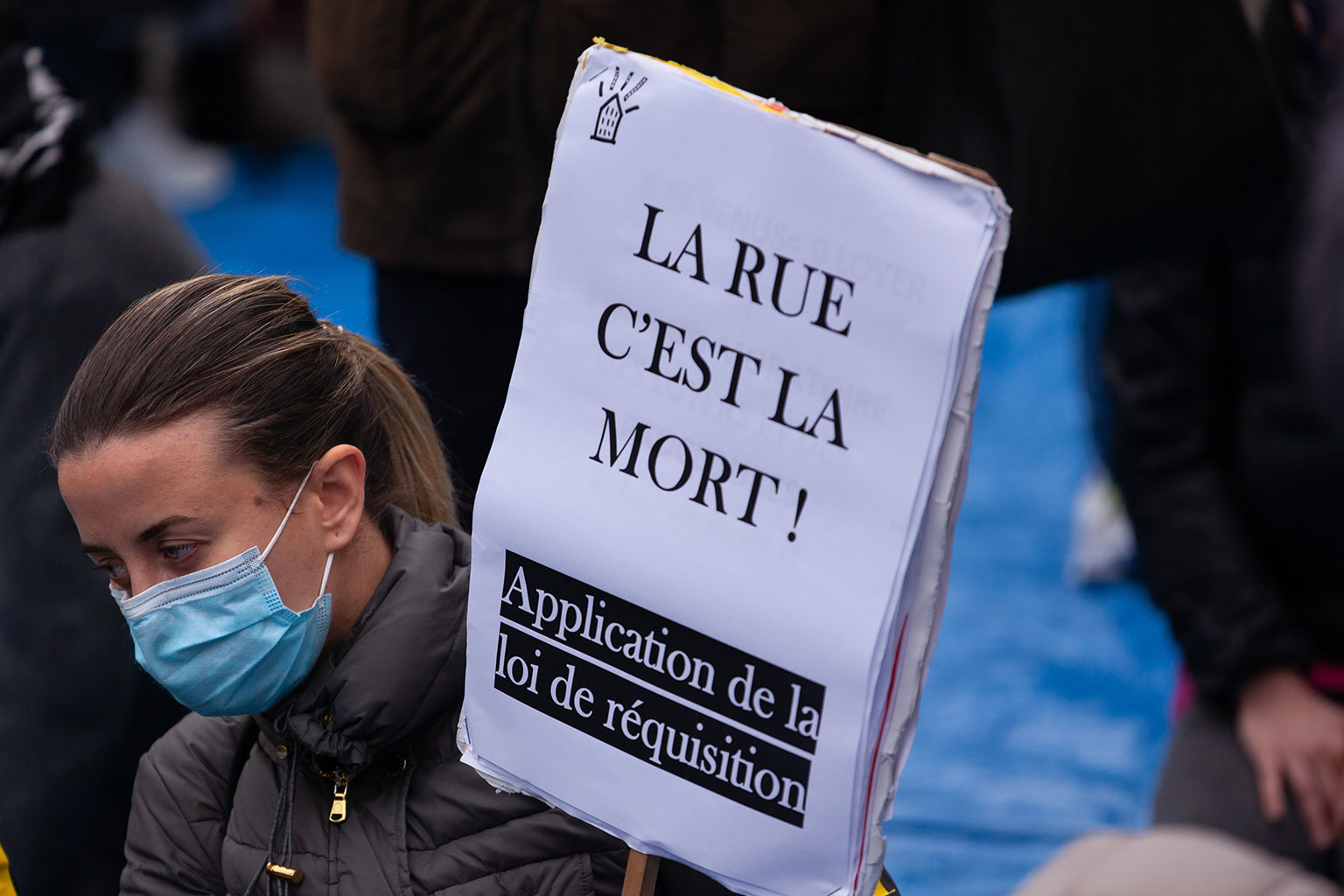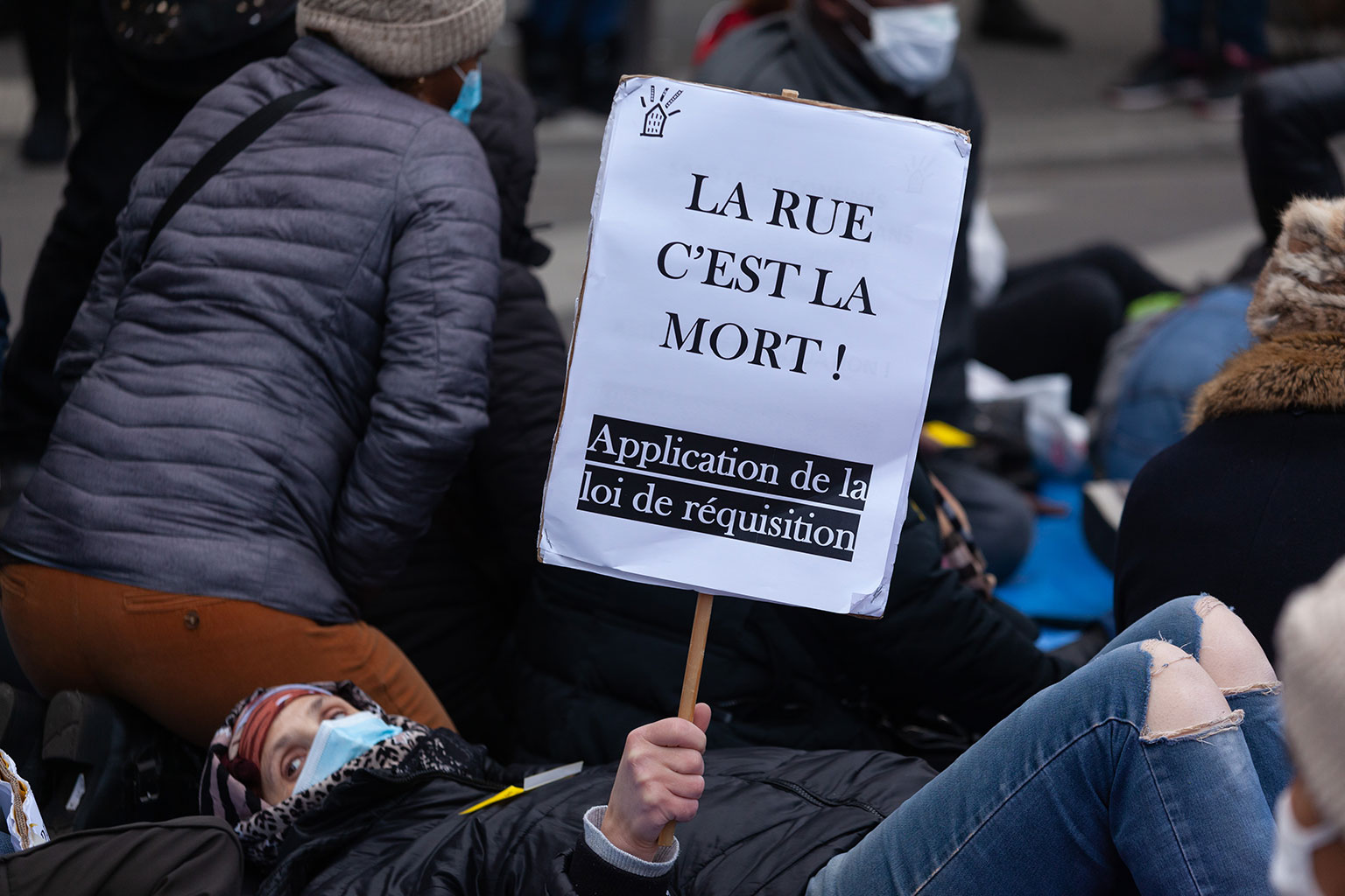 Ce rassemblement se tenait une nouvelle fois pour réclamer la réquisition d’un immeuble entier, vide, ainsi que tous les logements vides à Paris, en Île-de-France, et en France, qui seraient en nombre suffisants pour loger toutes les personnes sans domiciles fixes ou sans-abris.