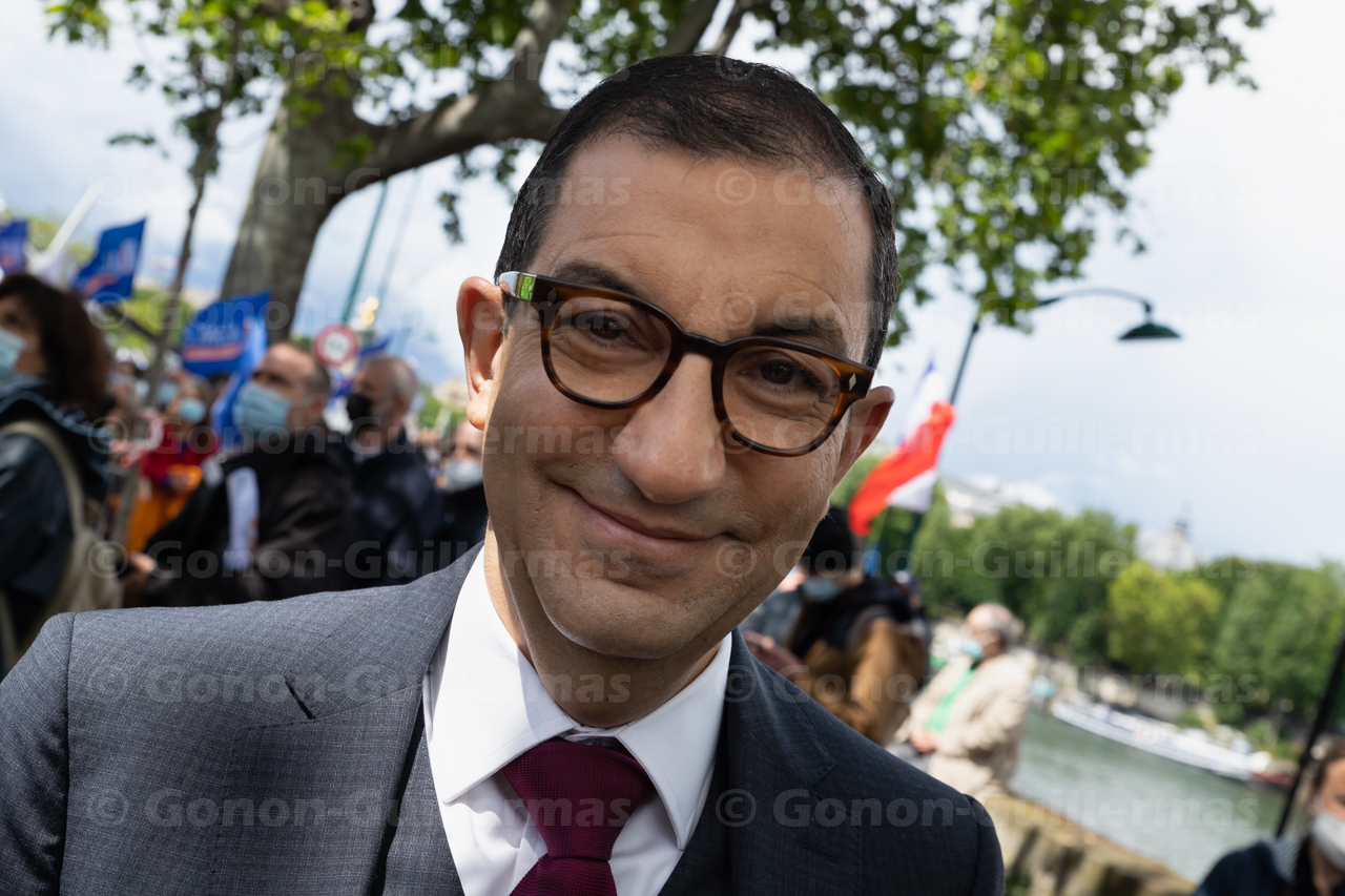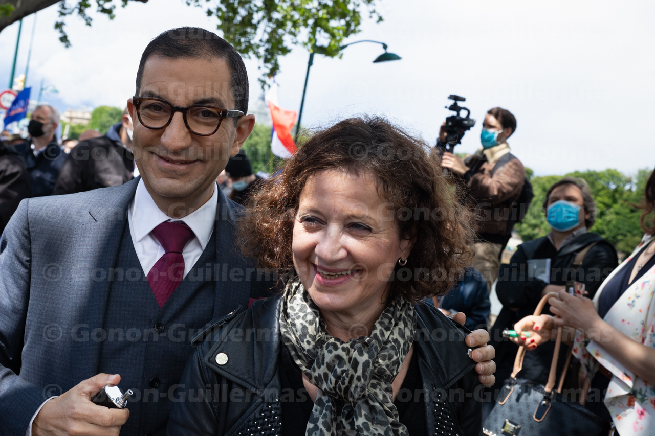 Jean Messiha, ex cadre du Rassemblement National, et Elisabeth Levy, directrice de la revue « Causeur » au rassemblement « syndical et citoyen » à l’appel de l’intersyndicale de syndicats de policiers, suite à l’assassinat de plusieurs policiers ces dernières semaines, le 19 mai 2021, Quai d’Orsay, devant l’Assemblée Nationale, à Paris.