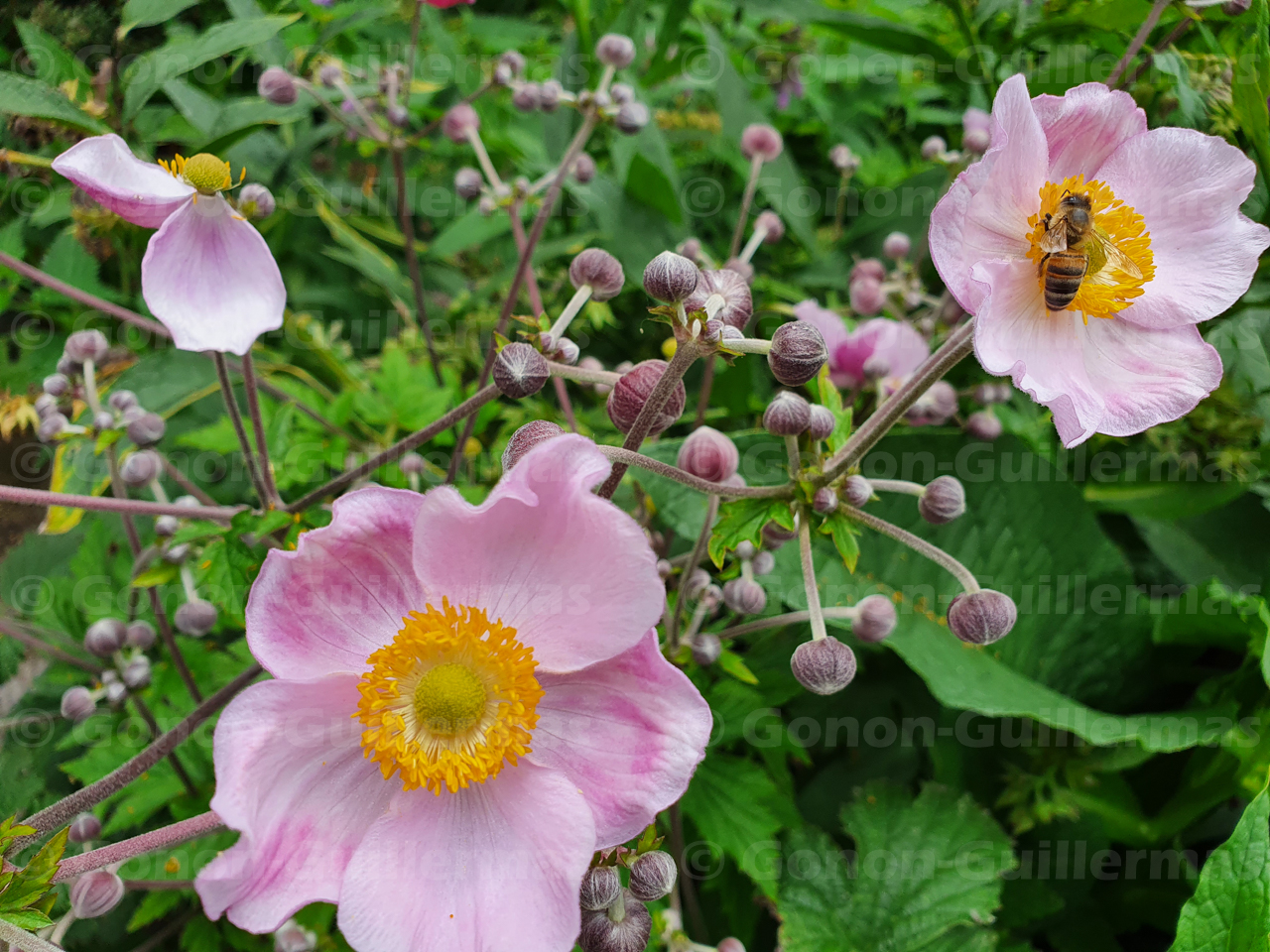 Abeille butinant des Anémones du Japon (Anemone hupehensis Lemoine) dans le jardin Anna Marly, Paris 14e.