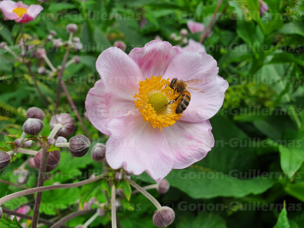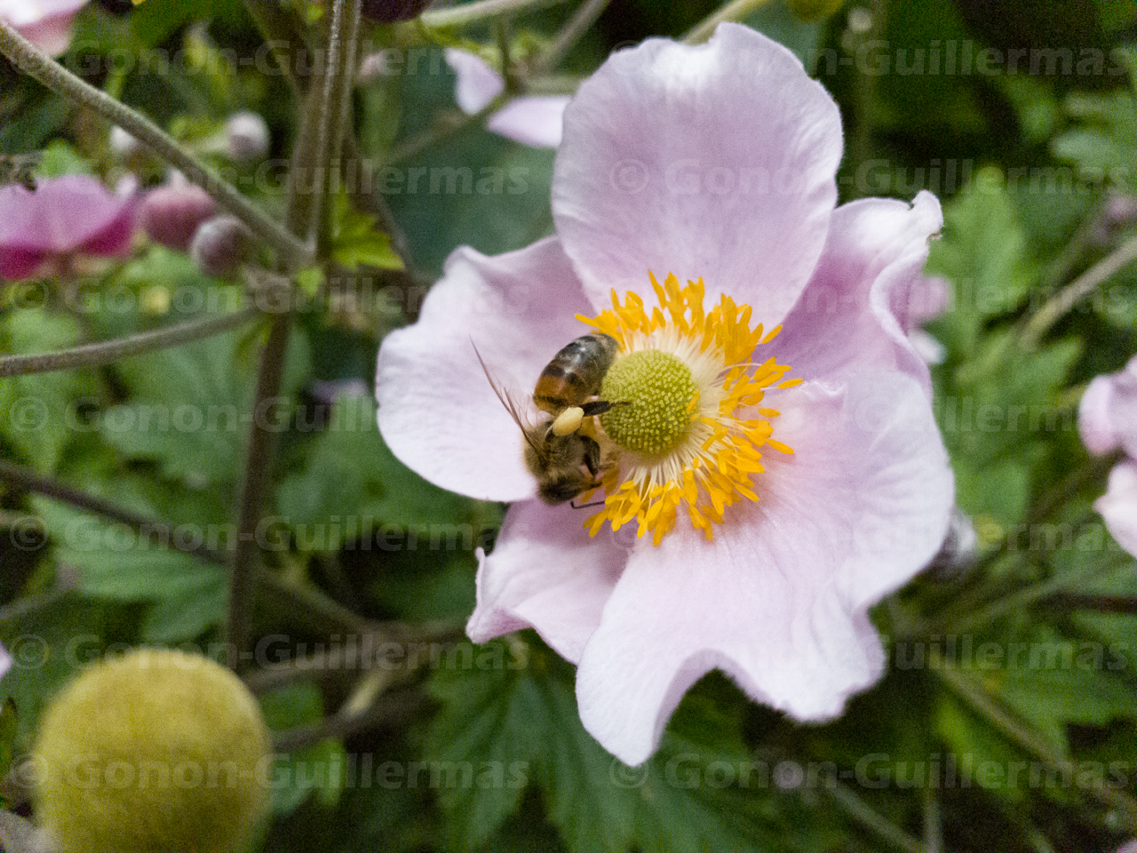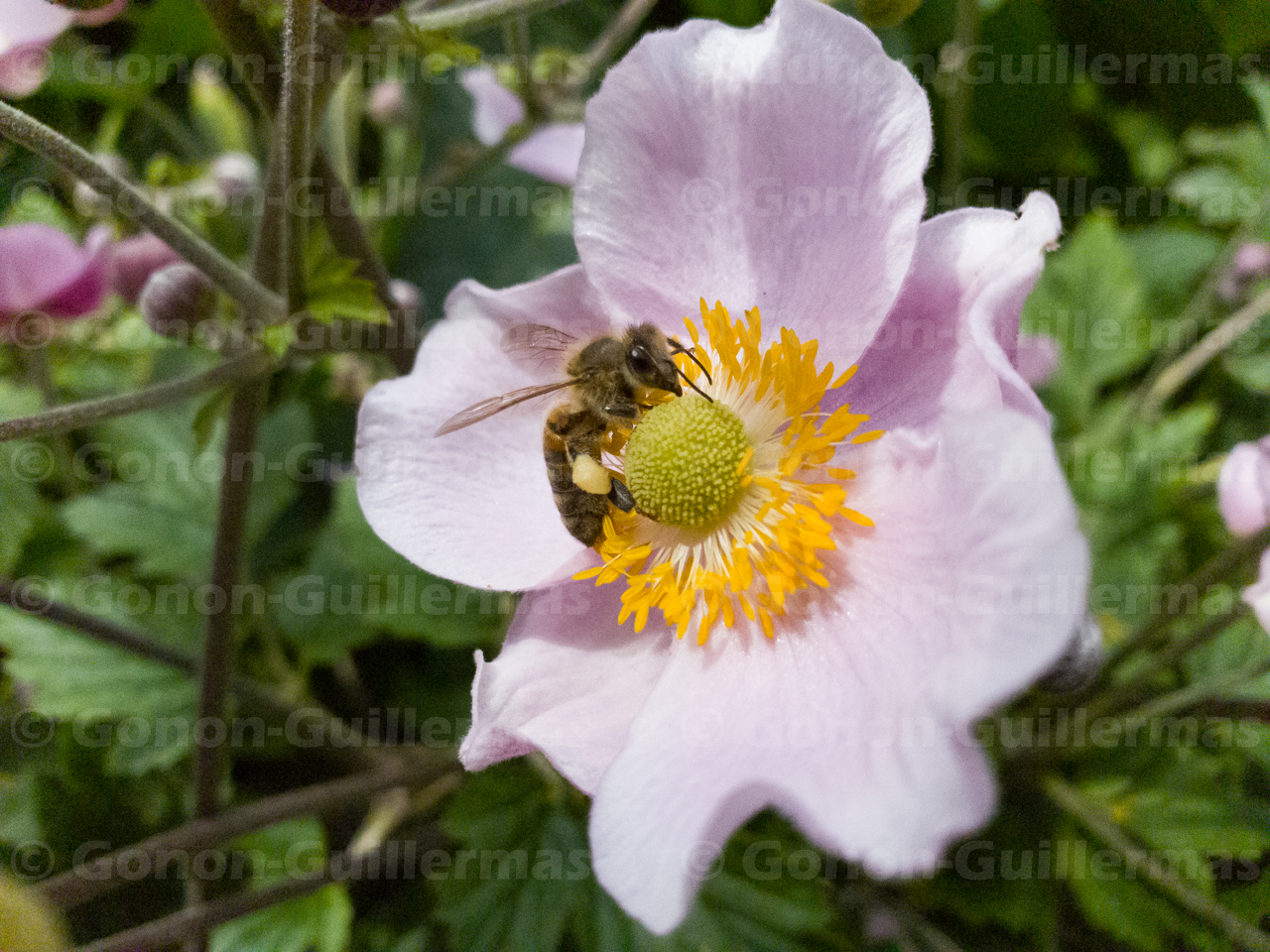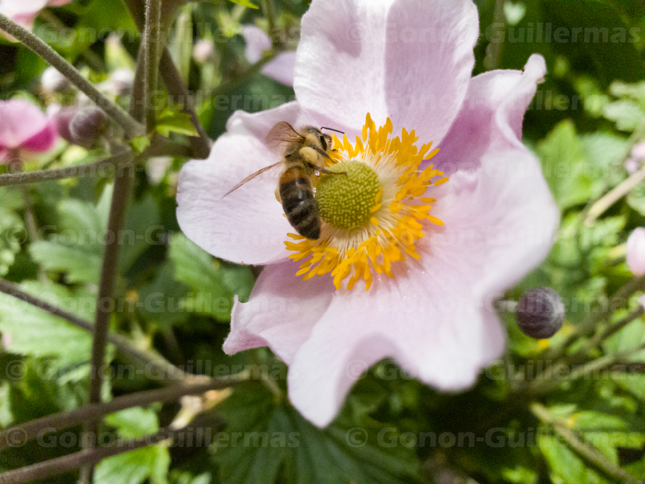 Abeille butinant des Anemone du Japon (Anemone hupehensis Lemoine) dans le jardin Anna Marly, Paris 14e.