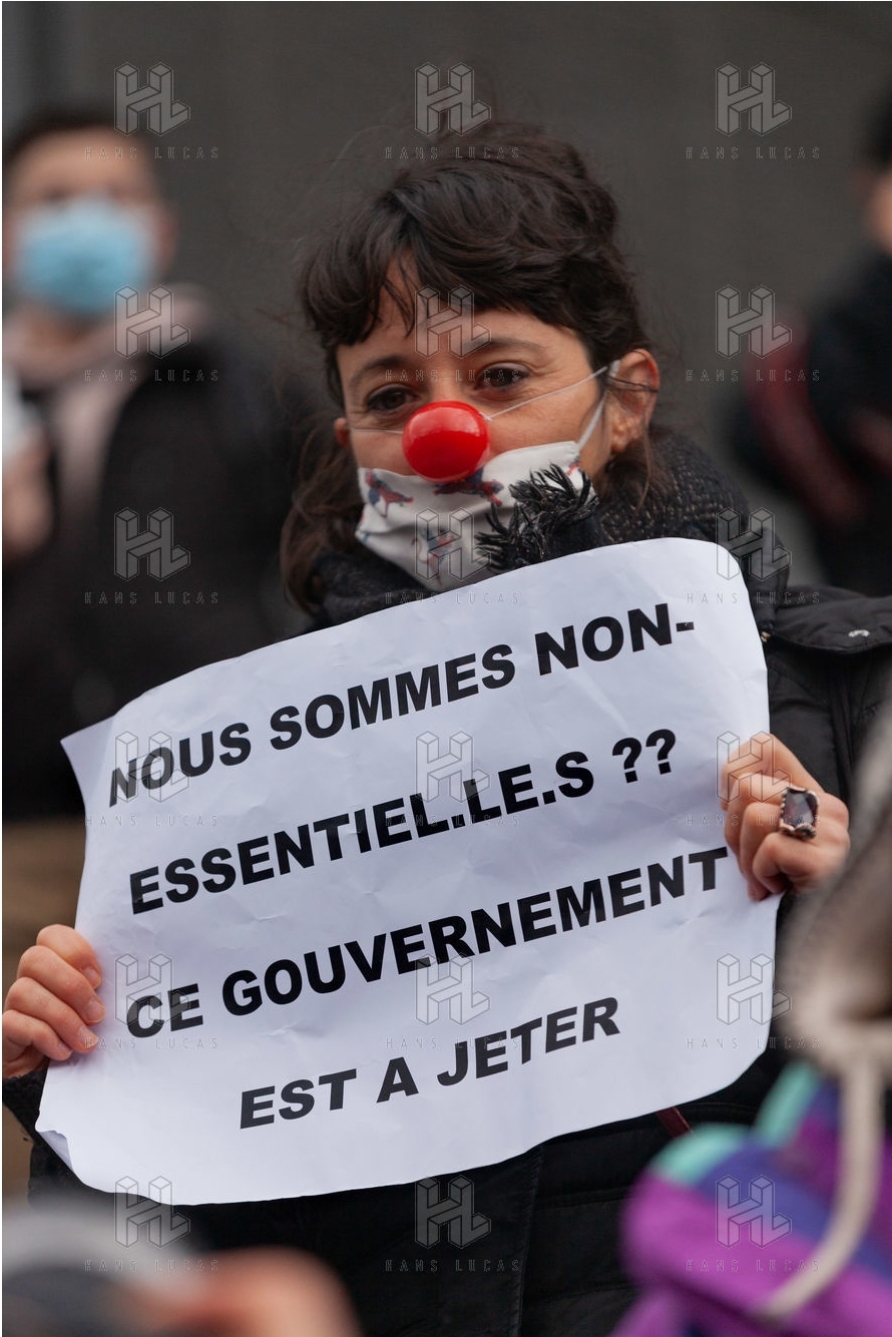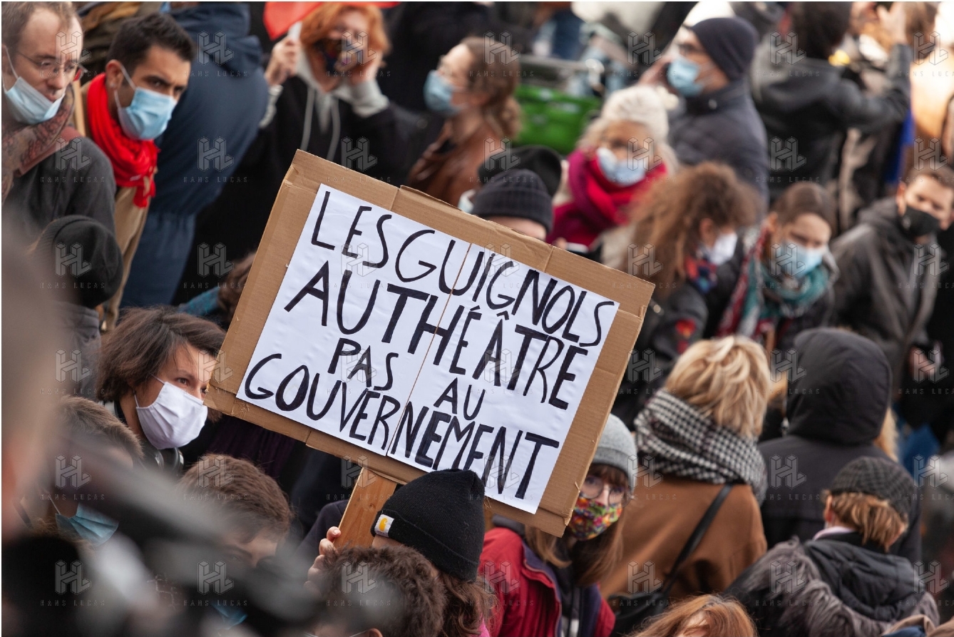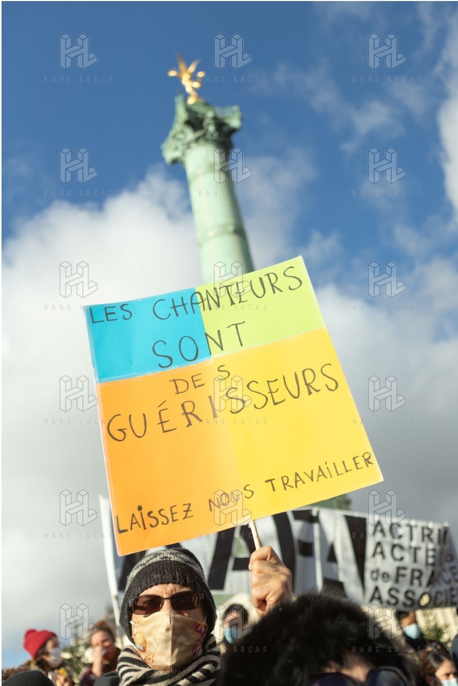 Manifestation parisienne du monde la culture le 15 décembre 2020, en immobile, sur la Place de la Bastille, pour réclamer la réouverture des cinémas, théâtres, et toutes salles de spectacle, suite à la mise en place du confinement.