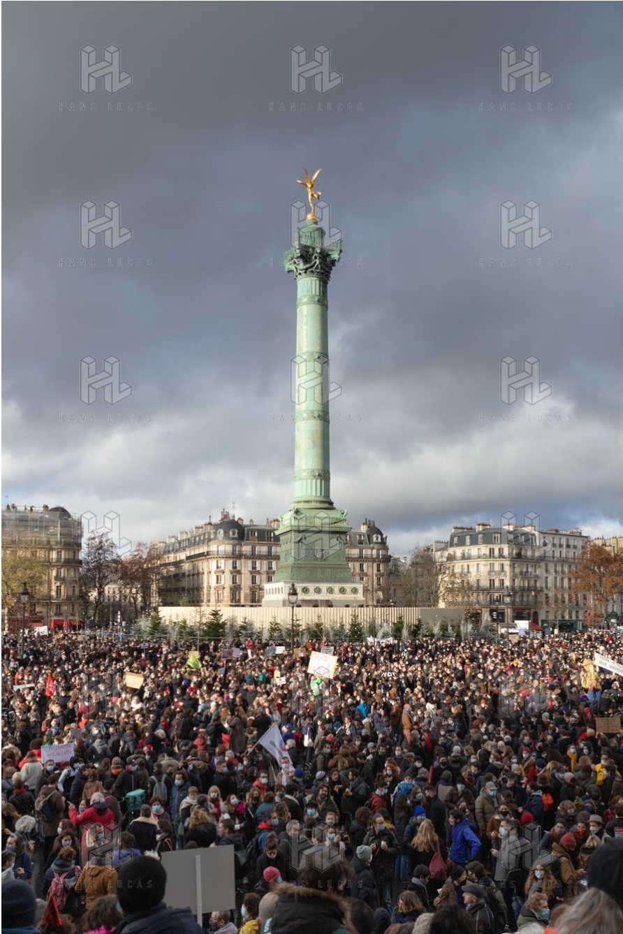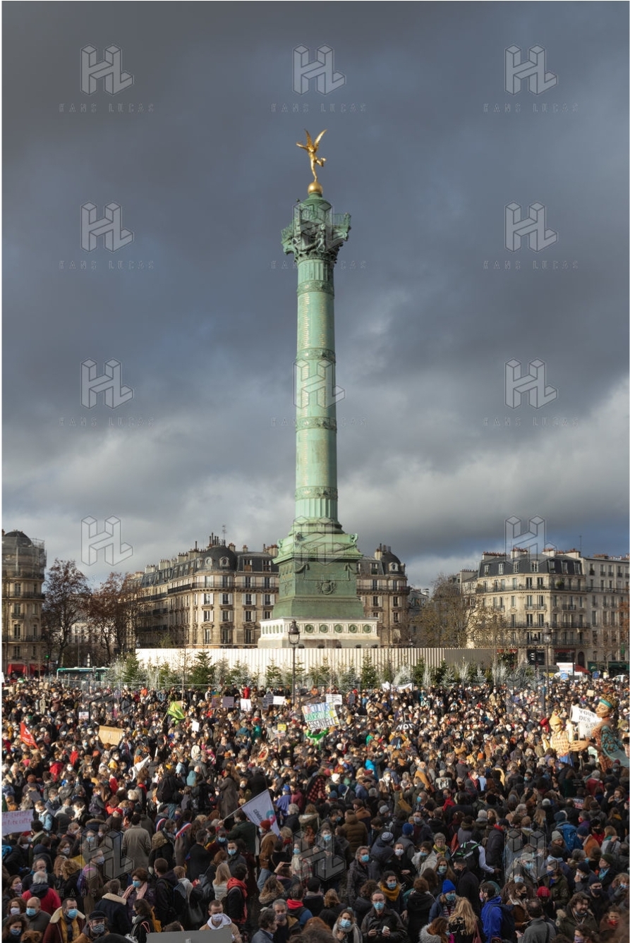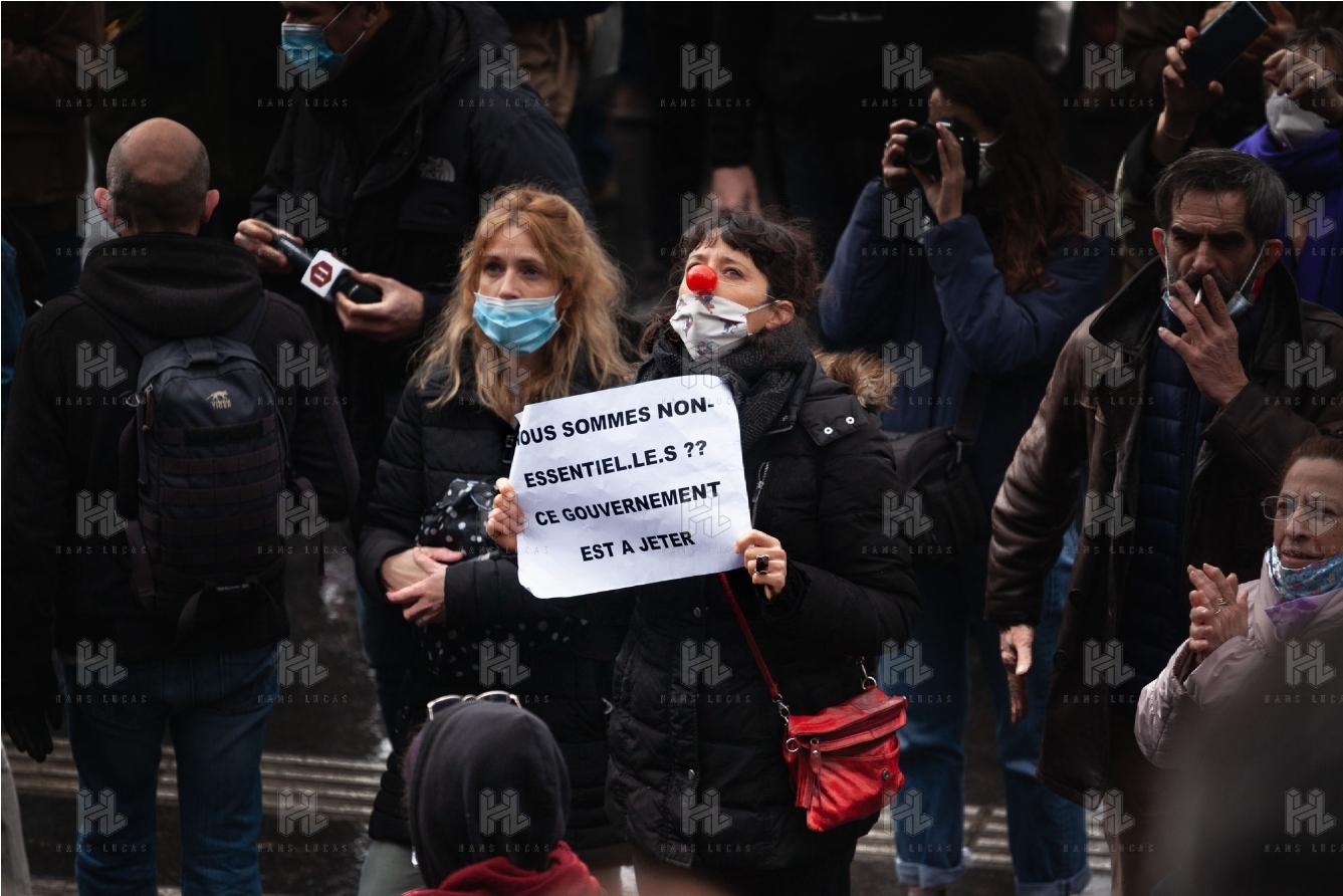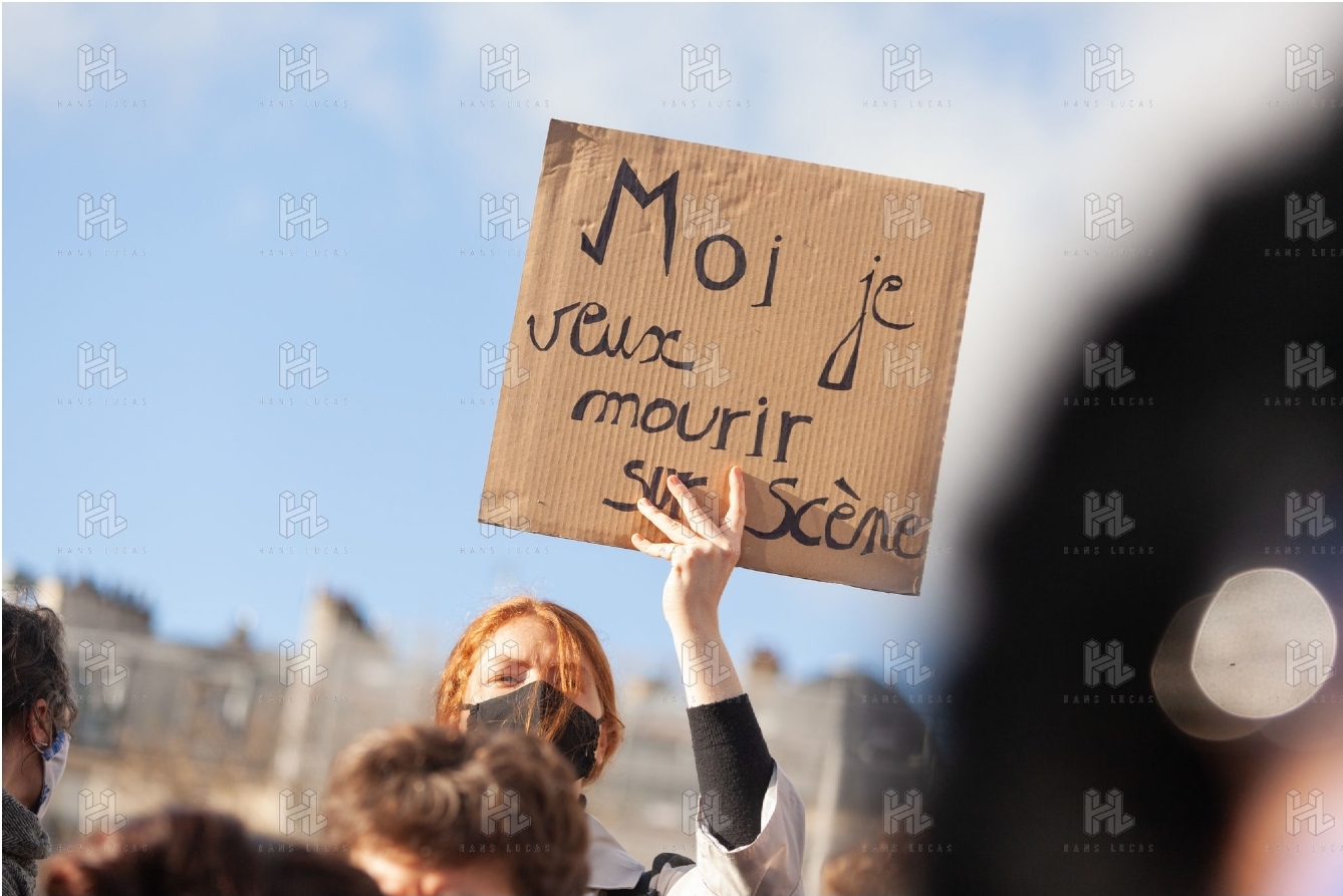 Manifestation parisienne du monde la culture le 15 décembre 2020, en immobile, sur la Place de la Bastille, pour réclamer la réouverture des cinémas, théâtres, et toutes salles de spectacle, suite à la mise en place du confinement.