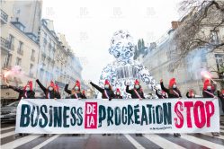 Action flash des jeunes de "La Manif pour Tous" devant le Sénat, mercredi 3 février 2021, à l'occasion de l'examen en seconde lecture du projet de loi de bioéthique